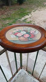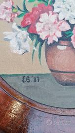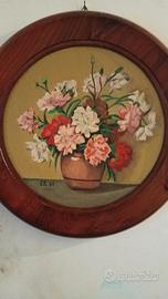 Dipinto rotondo su cartoncino telato, raffigurante vaso con fiori, tecnica usata colori a olio, con cornice originale in legno.