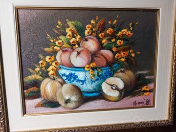Dipinto ad olio raffigurante una natura morta, opera dell'artista Ernesto Mazoni.