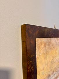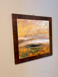 Dipinto a olio su pannello e cornice impiallacciati in radica di noce con finitura a gommalacca. Soggetto ispirato dai quadri di William Turner. ( ultima foto ). Dimensioni 55 x 55 x 4 cm spessore. Realizzato durante il corso di pittura paesaggio Scuola d’Arte di Cabiate (CO ). Certificato di autenticità.