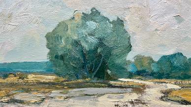 Il dipinto raffigura un paesaggio rurale, Italiano, Cremonese, caratterizzato da un grande albero solitario e un ruscello o sentiero che si snoda attraverso un terreno brullo. Lo stile pittorico, con pennellate materiche e una resa atmosferica, suggerisce un influenza della pittura paesaggistica post-impressionista della scuola di Sergio Tarquinio.