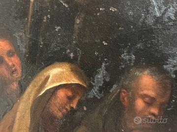 Raffinato dipinto devozionale del XVII secolo, raffigurante la Deposizione di Cristo, realizzato su supporto in rame, materiale pregiato e ricercato per opere di piccolo formato destinate alla devozione privata.