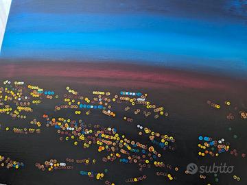 In lontananza, le luci della città emergono come piccole stelle terrestri, vibranti e suggestive. La tecnica a punti (dot painting) dona all’opera una straordinaria texture e un senso di movimento, creando un dialogo dinamico tra cielo e paesaggio urbano. Ogni punto di colore è applicato con cura, contribuendo a un effetto luminoso e quasi pulsante, che cambia intensità a seconda della luce e dell’angolazione da cui si osserva il quadro.