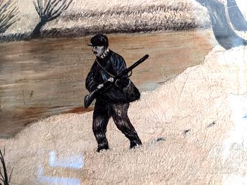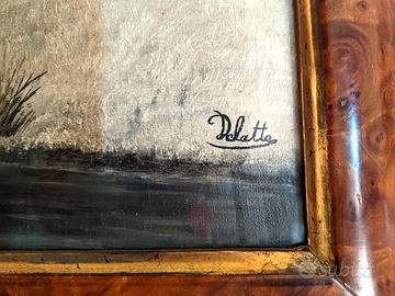 Dipinto con tecnica olio su tela, ricoperto da vetro. Opera firmata in basso a destra sul davanti, 'Delatte'. Misure 70 x 56 cm. Raffigura una scena di caccia in un paesaggio invernale innevato, con dovizia di particolari. Le condizioni sono ottime, ha una robusta cornice ed è pronto per essere appeso. Proviene da eredità. Ritiro a domicilio a Casalecchio o spedizione a pagamento.
