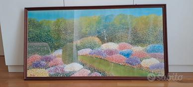 Quadro Bossi misure 100cm x 50cm con cornice Il dipinto raffigura un paesaggio di un giardino con cespugli colorati, alberi e un sentiero.La firma dell'artista, "Bossi", è visibile nell'angolo in basso a sinistra del dipinto
