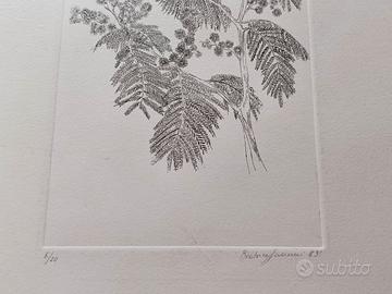 Litografia in bianco e nero disegno a china su carta di ramo fiorito.