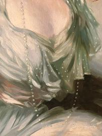 La dama indossa un abito vaporoso dai toni verde chiaro e avorio, arricchito da
