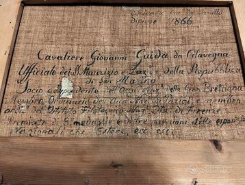 Dipinto firmato e datato (1866) del Cav Giovanni Guida da Cilavegna, con scritto nel retro " Ufficiale dei SS. Maurizio e Lazzaro e della Repubblica di San Marino. socio corrispondente dell'Accademia Nazionale della Gran Bretagna; membro ordinario dell'Accademia Nazionale di Parigi e membro ordinario dell'Istituto Fitotecnico Nazionale di Firenze. Premiato con 8 medaglie e 3 Menzioni nelle esposizioni Nazionali che estere, ecc. ecc.".