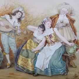 Dipinto tecnica mista: acquerello e tempera di alta qualità.. Magnifico dipinto del '800 che rappresenta un concertino amoroso e galante .eseguito magistralmente su tela di seta .Non ho da aggiungere molte parole ,basta osservare attentamente le numerose foto per capire la bellezza di questo dipinto. Il quadro misura cm.23 x 31 ottime condizioni come da foto.