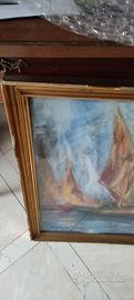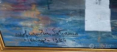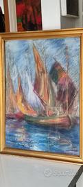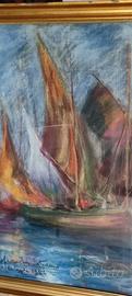 Bellissimo è raro quadro di Saturnino, grande pittore poliedrico Milanese nonchè grande tenore internazionale di nome Carlo Franzini (1923-2003) Si tratta di un'opera a gessetto del 1954 del suo periodo giovanile, piena di colori e sfumature di dimensioni importanti (68x47cm), che rappresenta un gruppo di vele a Chioggia. La cornice ha delle imperfezioni nella parte più esterna. La firma nel quadro è di per sè un'autentica. prezzo ribassato da 250 a 180 euro!!!