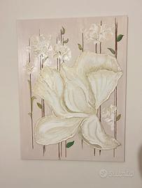 Dipinto su tela con tecnica mista acrilico e rilievo, realizzato a mano da Sonia Harris, artista napoletana. Opera unica che raffigura un fiore in esplosione di forme e volumi, con dettagli tridimensionali che donano profondità e luce. Ideale per arredamenti eleganti e moderni.