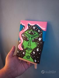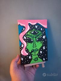 Mini tela 10x15cm, arte psichedelica e pop. Ritratto di un'aliena dallo sguardo magnetico e terzo occhio, tra spazio e sogni. Colori fluo, dettagli cosmici e spirito ribelle. Un pezzo unico per chi ama l’arte fuori dagli schemi.