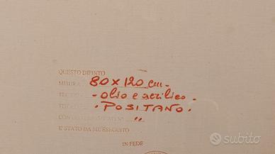 Bellissimo dipinto olio e acrilico su tela del maestro Ferdinando Sapio "Positano". Suggestiva vista dal lungomare, con i meravigliosi colori ed una luce che il maestro rappresenta in modo unico. Grande formato: tela 120cmx80cm, cornice 140x100. Autentica firmata a tergo sulla tela. Accetto offerte conformi. Valutazione oltre i millecinquecento euro, cedo ad un prezzo stracciato di € 500. Preferisco consegna a mano in zona. Eventualmente disponibile alla spedizione a carico dell'acquirente da concordare.