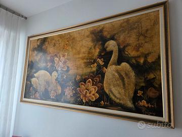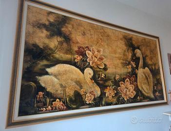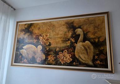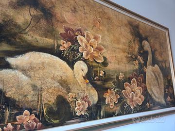 Tecnica: Olio su tela Dimensione: 215x115 Anno: 2001 🚚 Ritiro a mano La pittrice Fernanda Palvarini si contraddistingue, nella sua produzione pittorica, per un indissolubile legame con la natura che ama rappresentare nelle sue opere. I suoi soggetti preferiti sono i fiori, che non mancano mai nei suoi dipinti. In questa particolare opera il soggetto dei fiori si accompagna alla delicata rappresentazione di due cigni. Lo stile della pittrice Fernanda Palvarini si distingue per un’eccellente tecnica disegnativa. Come possiamo vedere in quest’opera, infatti, l’aspetto più saliente della rappresentazione è costituito dalla sua verità. Innanzitutto i fiori, riportati in ogni dettaglio e perfettamente caratterizzati in volumetria e plasticismo, così come i due cigni, descritti con eleganza in una forma pittorica viva e vibrante. Notevole è anche il gioco delle luci e delle ombre, che vivacizza ulteriormente i suoi dipinti aumentandone il realismo. In questa particolare opera, inoltre, Fernanda Palvarini introduce un ulteriore elemento di lirismo nella rappresentazione della natura. Infatti, sempre grazie alla sua elevata tecnica, connota quest’opera di una patina d’antico unificando la superficie cromatica con una tonalità bruna che ricorda una vecchia pergamena e simulando la crettatura del film pittorico. Fernanda Palvarini è un’artista di origine bresciana. Ha esposto le sue opere in moltissime importanti rassegne anche all’estero. Ricordiamo, tra le tante, le mostre presso il Castello di Orzinuovi, l’Hotel de Paris di Montecarlo, a Dallas, New York, Lugano, Zurigo, al Casinò di Sanremo e di Montecarlo. Nel 2004 ha ricevuto a Santo Domingo l’oscar “Premio pittura nel mondo”. E’ stata recensita dal critico Vittorio Sgarbi che l’ha definita “un’erede dell’espressionismo francese”. Nel 2007 ha ricevuto la cittadinanza onoraria della città di Ragusa. Nel 2013 ha donato un proprio dipinto a papa Francesco.