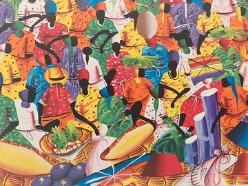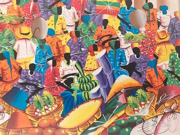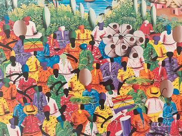 **🎨 Dipinto originale – Arte Naïf Haitiana | Scena di Mercato** Straordinario dipinto originale firmato, appartenente alla grande tradizione della **pittura naïf haitiana**. **L'opera** rappresenta una vivacissima scena di mercato popolare: decine di figure in abiti coloratissimi si muovono, commerciano e trasportano merci — ceste di frutta, verdura, rotoli di tessuto — in un'atmosfera festosa e brulicante di vita. Sullo sfondo, un paesaggio caraibico con capanne dal tetto di paglia, palme, alberi rigogliosi e il blu intenso del mare con barche a vela, completano la composizione. I colori sono **esplosivi e gioiosi**: arancio, giallo, viola, rosso, blu si intrecciano in un mosaico visivo di rara energia. Le figure stilizzate, con le caratteristiche teste ovali e i corpi dinamici, sono inconfondibilmente legate alla scuola naïf di Cap-Haïtien. Lo stile richiama i grandi maestri haitiani come **Seymour Bottex o Bernard Séjourné**, con una composizione affollata e ritmica che trasmette il calore e la vitalità della cultura caraibica. 📐 **Misure**: [100 cm x 75 cm] 🖼️ **Tecnica**: Acrilico su tela ✍️ **Firmato** in basso a destra Un'opera di grande impatto visivo, ideale per chi ama l'arte etnica, il colore e la cultura haitiana.