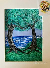 dipinto ad acrilico con cornice 18x24 dipinta blu.Un angolo di pace. Due alberi che si incontrano, il mare sullo sfondo e il silenzio della natura che avvolge tutto. Un’opera che porta calma, equilibrio e profondità in qualsiasi spazio.