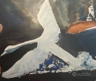 Dipinto Naif 1971 - Donna e Cigno - Firmato Bruno - Arte Vintage Tempera su cartoncino - 1971 - 36 x 23 cm circa Aspetti Tecnici e Conservazione Supporto e Tecnica La tempera su cartoncino è una scelta classica per i pittori Naïf, poiché permette stesure di colore dense e opache, favorendo una resa quasi "materica" pur su una superficie liscia Stato del cartoncino I bordi del cartoncino presentano delle irregolarità e dei piccoli fori (probabilmente dovuti a precedenti affissioni o alla natura artigianale del taglio - Il dettaglio, unito alla cornice gialla d'epoca, conferisce all'oggetto un sapore autentico e vintage Analisi Iconografica L'opera presenta una scena carica di simbolismo e atmosfera notturna Figura Femminile Una donna con lunghi capelli castani è seduta di schiena su quello che sembra un molo o un'altura. La sua posa è contemplativa, quasi malinconica Cigno L'elemento centrale è un grande cigno bianco che spicca violentemente contro lo sfondo scuro, colto nel momento di un fragoroso ammaraggio o decollo dall'acqua - Si nota la schiuma bianca resa con pennellate decise - Il cigno è spesso simbolo di purezza, trasformazione o un richiamo al mito di Leda Ambientazione Sullo sfondo a destra si scorge un piccolo insediamento o una chiesa con un campanile illuminato, che aggiunge un senso di solitudine e distanza - Il cielo è cupo, quasi tempestoso, tipico di una visione espressionista-naïf Stile e Firma Linguaggio Naïf Lo stile si riconosce dalla semplificazione delle forme, dall'uso di colori primari/contrastanti come il giallo del nome e della cornice contro il blu notte e da una prospettiva non accademica ma fortemente emotiva Firma Bruno 71 E' posta in basso a destra, tracciata con un giallo brillante e un segno calligrafico sicuro - L'anno 1971 colloca l'opera in un periodo di grande fortuna per il genere Naïf in Europa (si pensi alla scuola croata o ai seguaci di Ligabue in Italia) Si fornisce con cornice dell'epoca Condizioni come da foto