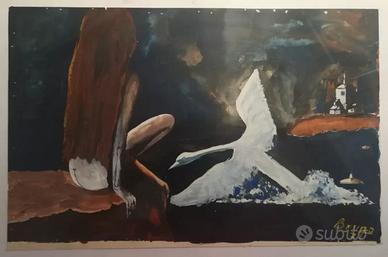 Dipinto Naif 1971 - Donna e Cigno - Tempera