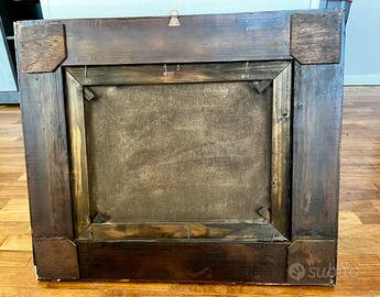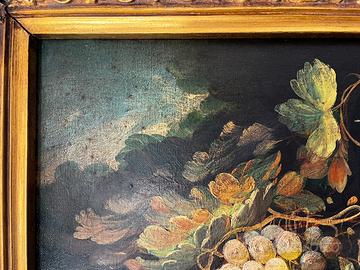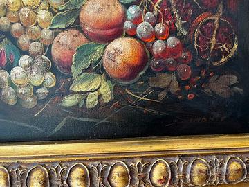 Dipinto a olio su tela raffigurante una ricca natura morta con frutta e fiori (uva, pesche, rose), ispirato alla grande tradizione della scuola italiana del Seicento. L'opera è di realizzazione metà/fine '900, eseguita con ottima tecnica pittorica che riproduce fedelmente le atmosfere e il chiaroscuro tipico delle tele antiche. Nonostante lo stile d'epoca, i materiali del telaio e il retro della tela ne confermano la natura di pezzo d'arredo di alta qualità del secolo scorso. Cornice: Importante cornice in legno dorato con decorazioni a rilievo, molto scenografica e in ottime condizioni. Dimensioni : 71x61