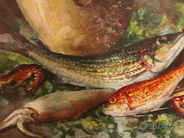 Bella mano del pittore "Arturo De Luca" , ( 1885 - 1971 ) . È un Olio su Tela , senza Cornice e 'della metà del 1900 circa e le misure del dipinto sono Larghezza cm. 70 x Altezza cm. 50. Rappresenta una Natura Morta con Pesci molto realistici e con toni di colore molto azzeccati .