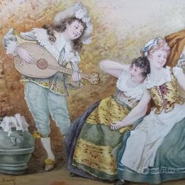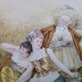 Dipinto tecnica mista: acquerello e tempera di alta qualità.. Magnifico dipinto del '800 che rappresenta un concertino amoroso e galante .eseguito magistralmente su tela di seta .Non ho da aggiungere molte parole ,basta osservare attentamente le numerose foto per capire la bellezza di questo dipinto. Il quadro misura cm.23 x 31 ottime condizioni come da foto.