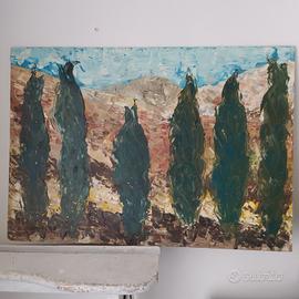 Dipinto olio su tavola, tecnica a spatola, cm 50x35 "Cipressi in Toscana" (1990) (senza cornice)