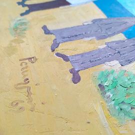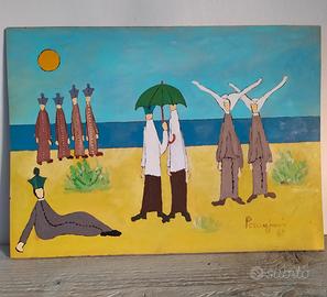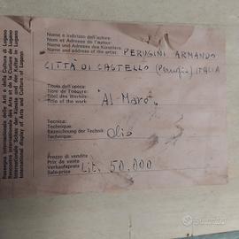 Dipinto olio su tavola, di Armando Perugini, 1969, "Al mare": sul retro certificato di acquisto (indicati l'autore, il titolo, il prezzo di vendita dell'epoca, proveniente da Rassegna Internazionale delle arti e della cultura di Lugano).