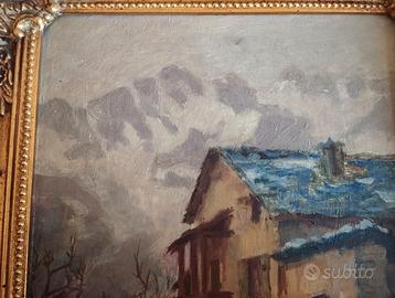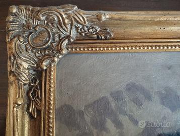 Splendido dipinto olio su tavola di metà Novecento, raffigurante un suggestivo scorcio paesaggistico. Cornice in legno intagliato e dorato completamente restaurato