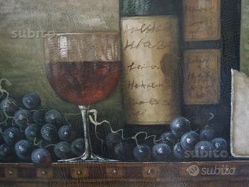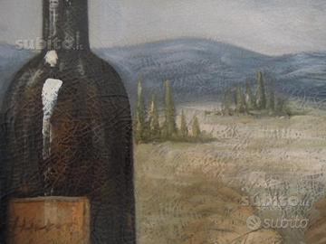 dipinto a olio su tela raffigurante due bottiglie di vino con calice, uva e formaggio, paesaggio sullo sfondo bellissimo per enoteche ne ho 2 simili zona nord Milano