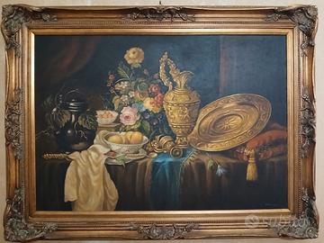 Opera suggestiva del pittore siciliano Giuseppe Massimino, raffigurante una raffinata natura morta con oggetti dorati, realizzata con tecnica ad olio su tela. Lo stile è realistico e classico, con un’eccellente resa della luce e dei dettagli. La tela è firmata e accompagnata da certificato originale del 1993. L’opera è proposta con cornice dorata in stile barocco.