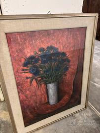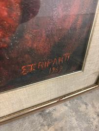 Dipinto originale raffigurante natura morta con fiori in vaso, caratterizzato da una forte intensità cromatica con sfondo rosso materico e fiori dai toni blu e verdi. Stile espressivo e pittorico, tipico della metà del Novecento. •Artista: E.T. Ripanti •Firma: presente in basso a destra •Anno: 1959 •Cornice: presente, d’epoca, in buone condizioni •Condizioni: buone condizioni generali, normali segni del tempo compatibili con l’età dell’opera Ideale per collezionisti, amanti dell’arte vintage o per arredare ambienti classici e moderni con un pezzo autentico e di carattere.