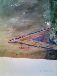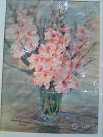 Dipinto ad acquerello con oggetto gladioli in vaso. In perfette condizioni è firmato dall'artista ad acquerello- A. Blasi- ma è privo di certificazioni. Il dipinto risulta essere particolarmente delicato, fine e armonioso. I gladioli sono rosa pesco sfumato con sfondo variegato in tonalità pastello varie e mescolate. La cornice in legno al tatto sembra vellutata, finemente lavorata.