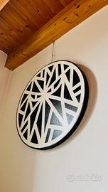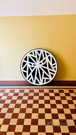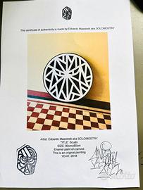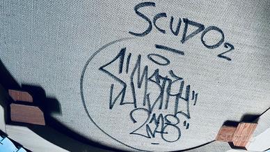 Dipinto in stile street graphic Solomostry smalto su tela “Black Knight” in raro formato scudo tondo ⌀80cm. Dai graffiti alle scenografie dei club techno milanesi, gli occhi malvagi del Black Knight di Solomostry ripresero a spiarci da quell’iconico intreccio grafico risorgendo negli angoli bui delle strade, mossi dall’idea di “esasperare e ridisegnare le crepe della città attraverso la forza della linea". Risorti dalla clandestinità, i “Black Knight” di SLMSTRY fecero subito un gran parlare di sè, incontrando il favore della critica così come quello del pubblico. Oggi su pubblicati su cataloghi d’arte ed esposti in MOSTRE personali e collettive in gallerie di tutta Europa. Un Black Knight VIGILA gli angoli bui delle case più cool, con quello sguardo MESSO AL MURO come vorremmo fosse fatto con tutti i nostri mostri interiori. La forma “scudo” è una variante rara e molto ricercata rispetto ai “tradizionali” formati squadrati. Dai muri delle strade a quelli delle case che meritano un must-have irrinunciabile. AUTENTICA cartacea autografa dell’artista viene allegata all’opera. Spedizione in tutta Italia con tracking number e assicurazione. 2018, smalto su tela,⌀80 x 4,5 cm, 5kg Bio, interviste, critiche, mostre e pubblicazioni facilmente googlabili alla voce “Solomostry”. Grazie.