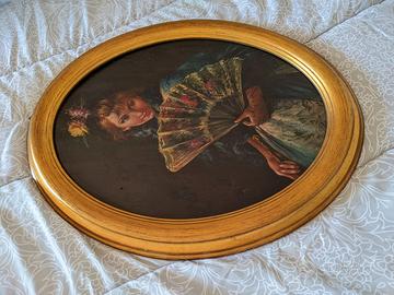 Bellissimo dipinto a mano, su base ovale in legno, avente come oggetto una dama con ventaglio, attribuito al noto pittore italiano Clemente Tafuri (Salerno, 18 agosto 1903 – Genova, 11 dicembre 1971). Dimensioni lungo gli assi principali: 47 x 37,5 cm e 38 x 28 cm rispettivamente con e senza cornice dorata.