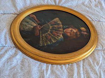 Bellissimo dipinto a mano, su base ovale in legno, avente come oggetto una dama con ventaglio, attribuito al noto pittore italiano Clemente Tafuri (Salerno, 18 agosto 1903 – Genova, 11 dicembre 1971). Dimensioni lungo gli assi principali: 47 x 37,5 cm e 38 x 28 cm rispettivamente con e senza cornice dorata.