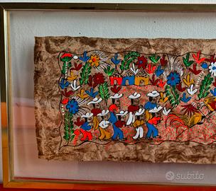 Splendido dipinto artigianale su carta d’amate originale, raffigurante una vivace scena folkloristica. Opera di grandi dimensioni (65x30 cm) incorniciata a doppio vetro per esaltare i bordi naturali della corteccia.