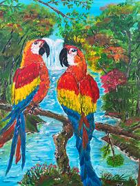 Titolo: Pappagalli Dipinto su tela che raffigura una vivace scena con pappagalli dai colori brillanti, immersi in un contesto naturale ricco di luce e dettagli. Le tonalità accese e la composizione armoniosa trasmettono energia e allegria, rendendo l’opera capace di catturare l’attenzione e donare un tocco esotico e decorativo agli ambienti. Dimensioni: 40 x 50 cm Supporto: tela (venduta senza cornice) Colore: acrilico Ideale per arricchire gli spazi con un elemento fresco, colorato e pieno di vitalità.