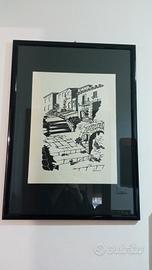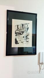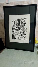 Vendo disegno a china su carta, vintage , firmato e datato 1974. Raffigura un suggestivo paesaggio in stile mediterraneo con architettura in pietra, scale e ponte. Opera in bianco e nero molto decorativa, ideale per arredamento classico o moderno. Il quadro e' incorniciato e in buone condizioni generali. La firma è presente, ( in basso a destra) ma non attribuita con certezza. Misure: altezza 71 cm, larghezza 52 cm. Condizioni buone. Prezzo trattabile. Consegna a mano o spedisco.