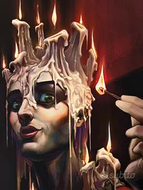 Opera digitale raffigurante un uomo dal volto realistico e intenso, avvolto da cera fusa che scende dalla testa e dalle spalle come una corona di candele accese. Le fiamme illuminano il viso creando un forte contrasto tra luce e ombra, mentre il soggetto tiene in mano un fiammifero acceso, elemento che aggiunge tensione e significato simbolico. Stampa su carta cotone, numerata 1/100 dimensione A3