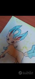 La figura del Pokemon Leafeon (evoluzione di tipo erba di Eevee) è disegnata e colorata con pennarelli marker ad alcol mentre lo sfondo è ad acquerello.