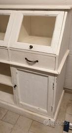 Mobile dispensa pastaia per sala da pranzo/cucina in legno di mango verniciato stile shabby a poro aperto. Linea Loberon. Tre sportelli apribili con vetro, due sportelli in legno, tre cassetti. Dimensioni L/A/P ca. 129/106/45 cm. Buone condizioni. Ritiro a domicilio zona Reggello (30 km da Firenze). No spedizione