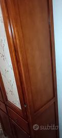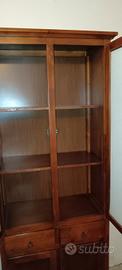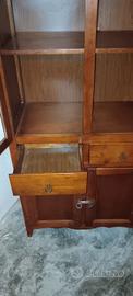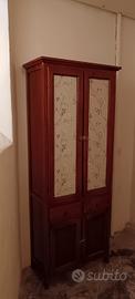 Vendesi elegante mobile a colonna in legno color noce, caratterizzato da un design caldo e versatile. Perfetto per la cucina come dispensa, in soggiorno come vetrina per i piatti o in uno studio per libri e documenti. Caratteristiche principali: Vano Superiore: Due ante a vetro decorate internamente con una raffinata carta da parati a motivi floreali (removibile se si preferisce il vetro trasparente). All'interno sono presenti 3 ampi ripiani fissi. Cassetti centrali: Due cassetti indipendenti con pomelli ad anello in metallo brunito, ideali per posateria o piccoli oggetti. Vano Inferiore: Doppia anta chiusa in legno per riporre oggetti ingombranti al riparo dalla polvere. Dettagli: Chiusure originali a scorrimento e base sagomata che dona un tocco artigianale. Dimensioni: Altezza: 198 cm Larghezza: 74 cm Profondità: 35 cm Stato del mobile: Il mobile è in buone condizioni strutturali. Presenta alcuni naturali segni del tempo sulla finitura (visibili sui ripiani interni) che ne accentuano il carattere vintage/rustico. Può essere utilizzato così com'è o si presta perfettamente per un progetto di restyling (decapato o colorato). Da ritirare a Trento.