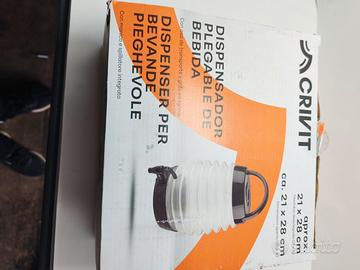 Vendo distributore d'acqua pieghevole Crivit, ideale per campeggio, picnic, spiaggia, feste in giardino o semplicemente per casa. Prodotto NUOVO, mai usato, completo di scatola originale. Punti di forza: Capacità: 5,5 Litri. Salvaspazio: Il corpo a fisarmonica si comprime completamente per un ingombro minimo quando non in uso o per il trasporto. Pratico Rubinetto: Facile da erogare acqua (o altre bevande). Include una piccola goccia decorativa rimovibile sul rubinetto (come si vede nelle immagini della confezione). Portatile: Dotato di una robusta maniglia per il trasporto anche quando è pieno