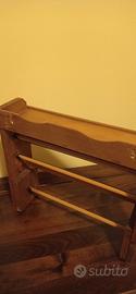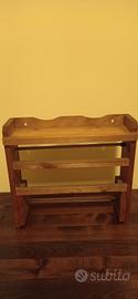 Dispenser da parete in legno, con finitura naturale, a tre livelli per pellicola trasparente e carta stagnola con taglierina; in basso rotolo di carta da cucina. Il bordo superiore presenta due fori preforati per il montaggio a parete e un'ampia base come soluzione salvaspazio per organizzare le spezie in cucina. Usato, in buono stato. MISURE cm 34x9xh31 Offro a €10,00