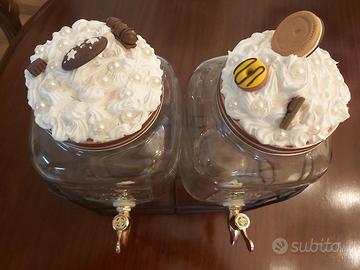 CONRENITORE DISPENSER LIQUIDI IN VETRO COUNTRY STYLE CON RUBINETTI E TAPPI DECORATI A TEMA DOLCIARIO E SUPPORTO IN METALLO SCURO, CM.35X35X17,NUOVO MAI USATO.