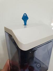 Dispenser sapone da muro, funzionante, con chiave per chiudere ed aprire il serbatoio. Misure Altezza: 25cm Larghezza: 13cm Profondità: 10cm