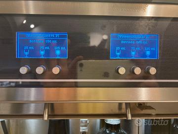 Wine emotion macchina per il mantenimento e la mescita di vino usata solo 6 mesi. UTILIZZO ED ATTIVAZIONE Il dispenser funziona sia in modalità “Retrobanco” che in modaltà “Self Service”. L’attivazione avviene tramite smart card (chip o RFID) oppure tramite Barcode. TEMPERATURE DI SERVIZIO Due zone completamente indipendenti con temperature impostabili dai 6°C ai 22°C DOSI Fino a tre dosi per bottiglia selezionabili da tasti meccanici di alta qualità. INTEGRAZIONE SOFTWARE Connessione tra moduli e software attraverso cavo LAN o WI/FI* tramite protocollo TCP/IP0. SISTEMA DI SOLLEVAMENTO BOTTIGLIE Sistema di sollevamento bottiglie tramite pistoni pneumatici. SISTEMA DI REFRIGERAZIONE Moderno sistema di refrigerazione professionale no-frost completamente silenzioso. WINE CARD Sistema con carta Chip o RFID. GAS Azoto o Argon alimentare (bombola o generatore non inclusi). PERSONALIZZAZIONI Il colore delle parti metalliche esterne può essere personalizzato. ILLUMINAZIONE LED Sistema di illuminazione intelligente a led con risparmio energetico. Led RGB per infinite combinazioni di colori. SERRATURA ELETTRONICA Serratura elettronica attivabile tramite pulsante Menu. VETRI ANTI CONDENSA I vetri delle porte sono trattati con un filtro speciale che impedisce la formzione di condensa