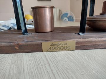 Distillatore per uso domestico/hobbistico denominato "Alambiccus Arrigus". Realizzato completamente in rame e montato su una solida base in legno. Utilizzato una o due volte, poi lasciato ad impolverarsi per circa 30 anni.
