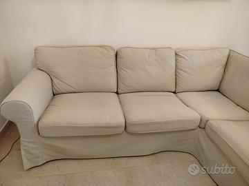 Se hai tempo prepara l'annuncio: Divano Ektorp IKEA angolare in buone condizioni. Cuscini con base in gomma piuma con strato superiore in piuma d'oca. Struttura in legno.