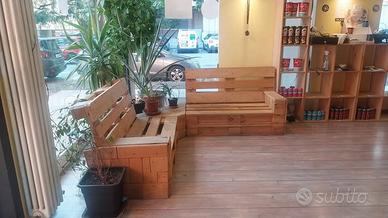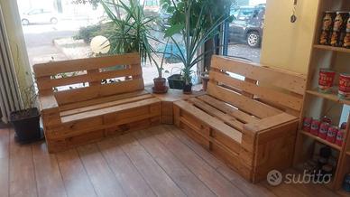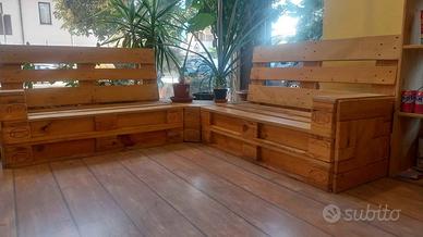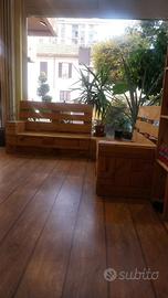 Set di divanetti artigianali in pallet EPAL, lavorazione a mosaico, robusti e di grande impatto estetico.