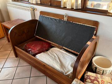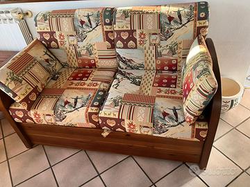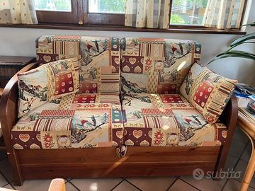 Coppia divani in legno massello, di falegnameria, con contenitori salva spazio. cm.130×80h85 con sedute e cuscini rivestiti in tessuto riproducenti scene di montagna. adattissimi per baite o chalet. prezzo 500 € cad. 950 € la coppia consegna solo a mano a Cantalupa (to)